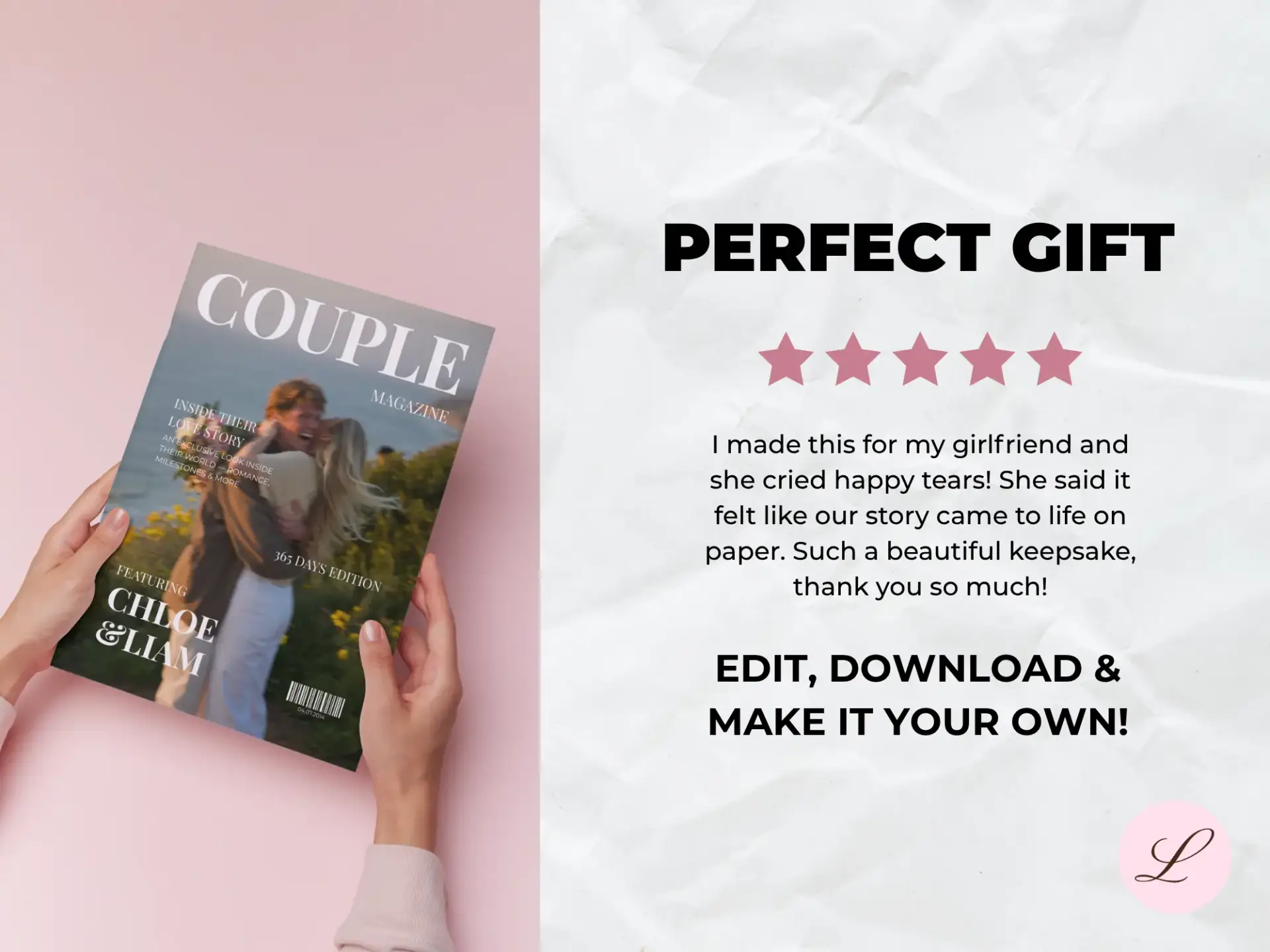 The “You and Me” Magazine lets you design a personalized couple magazine in just minutes. Add your favorite photos, write your own headlines and articles, and play with layouts to capture your unique bond. Whether it’s a surprise for your partner or a fun project to do together, it’s a keepsake that feels straight from the heart.